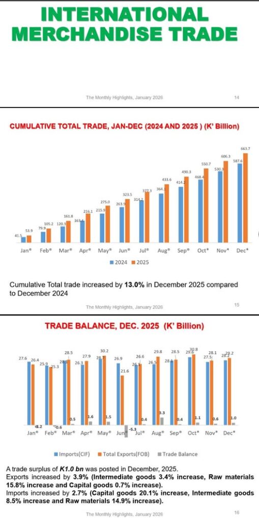 December 2025 also saw Zambia record a trade surplus of K1 billion, reversing earlier deficits and signalling improved external balances. Total exports (FOB) grew by 3.9 percent compared to the same month in 2024, led by a 15.8 percent rise in raw materials and a 3.4 percent increase in intermediate goods. Capital goods exports also rose marginally by 0.7 percent.